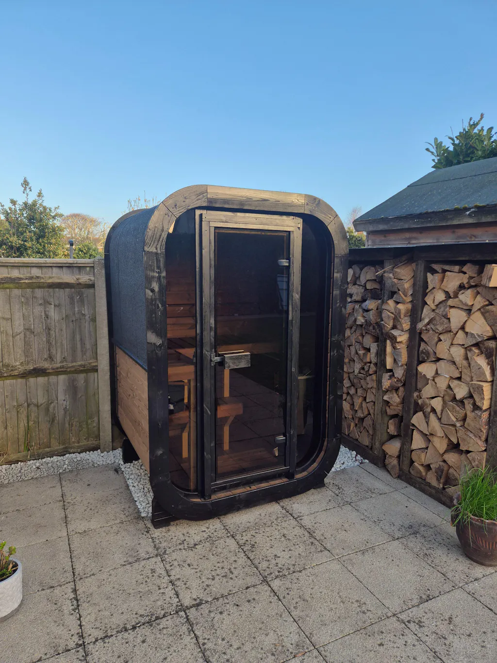 The ULLA Sauna is built to perform and impress. Its clean, dark exterior finish pairs beautifully with the warm tones of thermopine wood, creating a bold and modern outdoor statement piece.